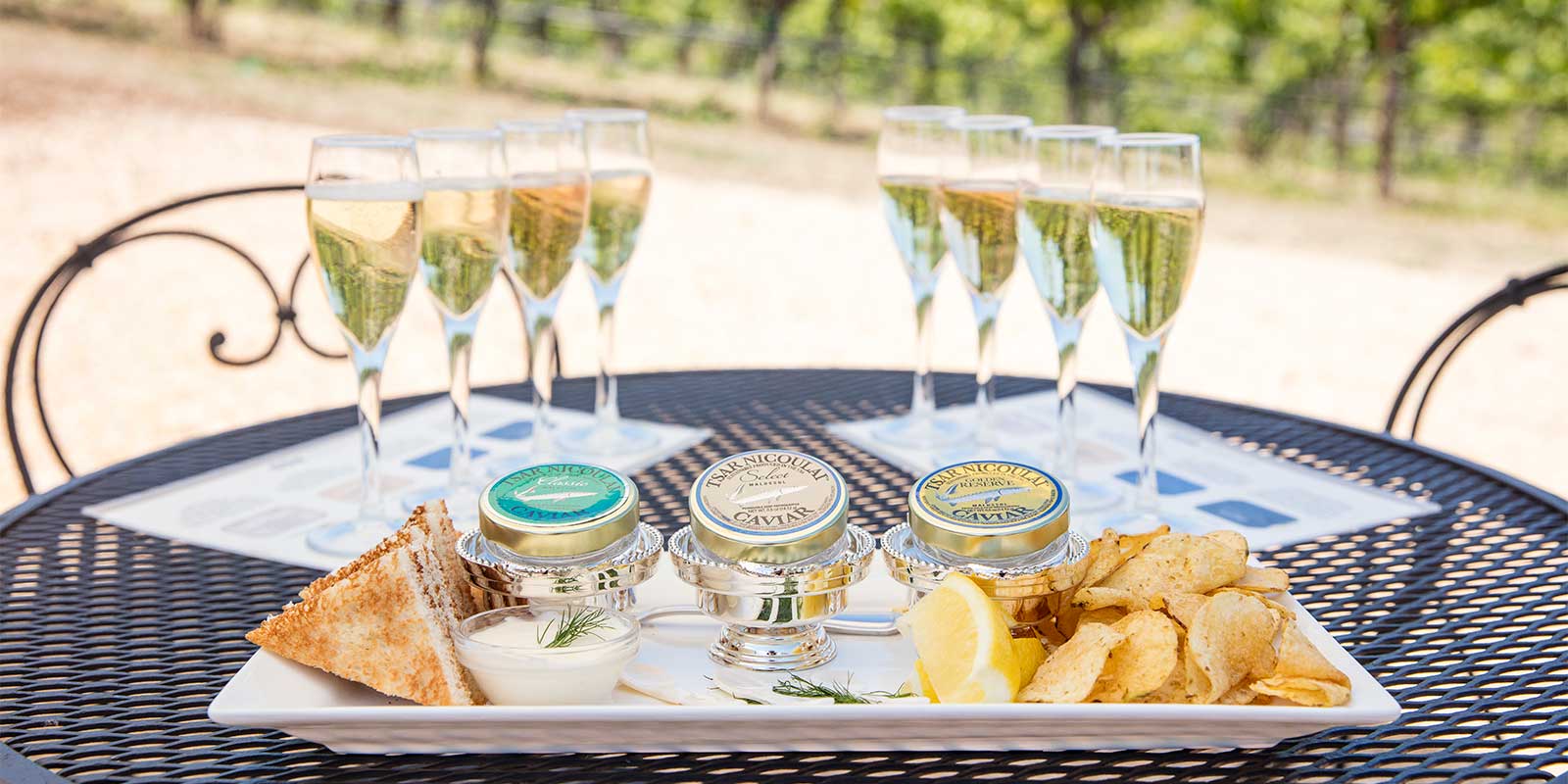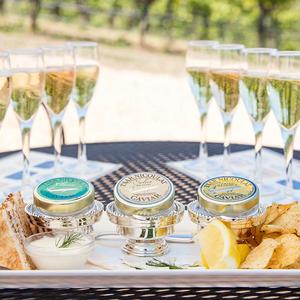 Caviar and sparkling wine – classical apart, iconic together. Add rich crème fraîche and the crunch of a potato chip and you have elevated the pairing to a new level. In this experience, you will sample four of our most highly treasured wines alongside three ½ ounce servings of Tsar Nicoulai Caviar’s finest artisanal caviars.