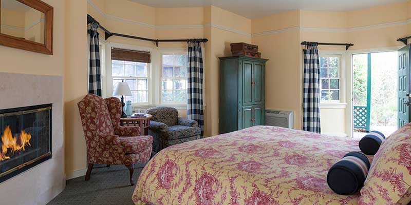 Each guestroom features a queen or king bed, and many feature a fireplace, patio or jetted spa tub.