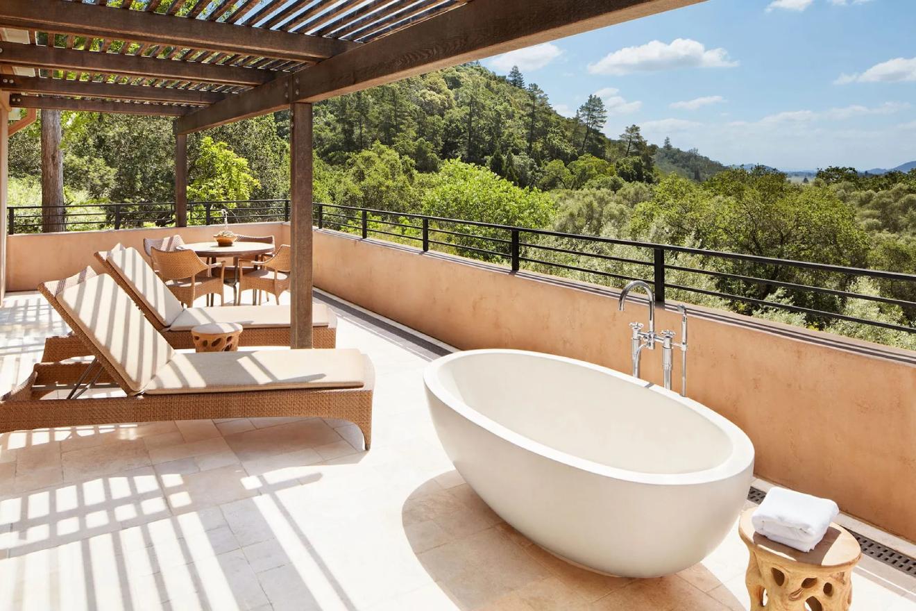 Of all of the Napa Valley resorts, this one truly embraces the agrarian roots of the area in terms of style. Think ice cream, bicycles, cottages, fresh donuts, lazy days, outdoor showers, and a curtain of stars in the night sky. Here the newly-revamped spa will pamper you, the hilltop pool with vineyard views will delight you, and the excellent restaurants that source fresh ingredients from their garden and local farms, will inspire you. Up-market ambience is delivered at Carneros with a casual vibe; like the heated slate floors in the bathroom, or the thoughtful addition of rocking chairs on your deck that invite you to sit a spell. Guests will love the perfect simplicity delivered with style.